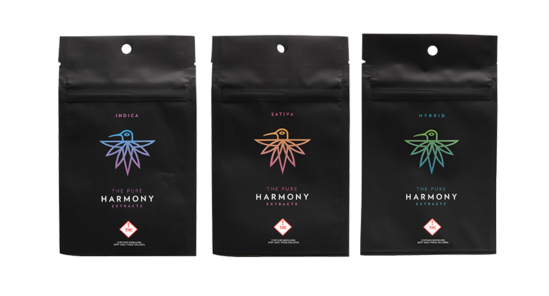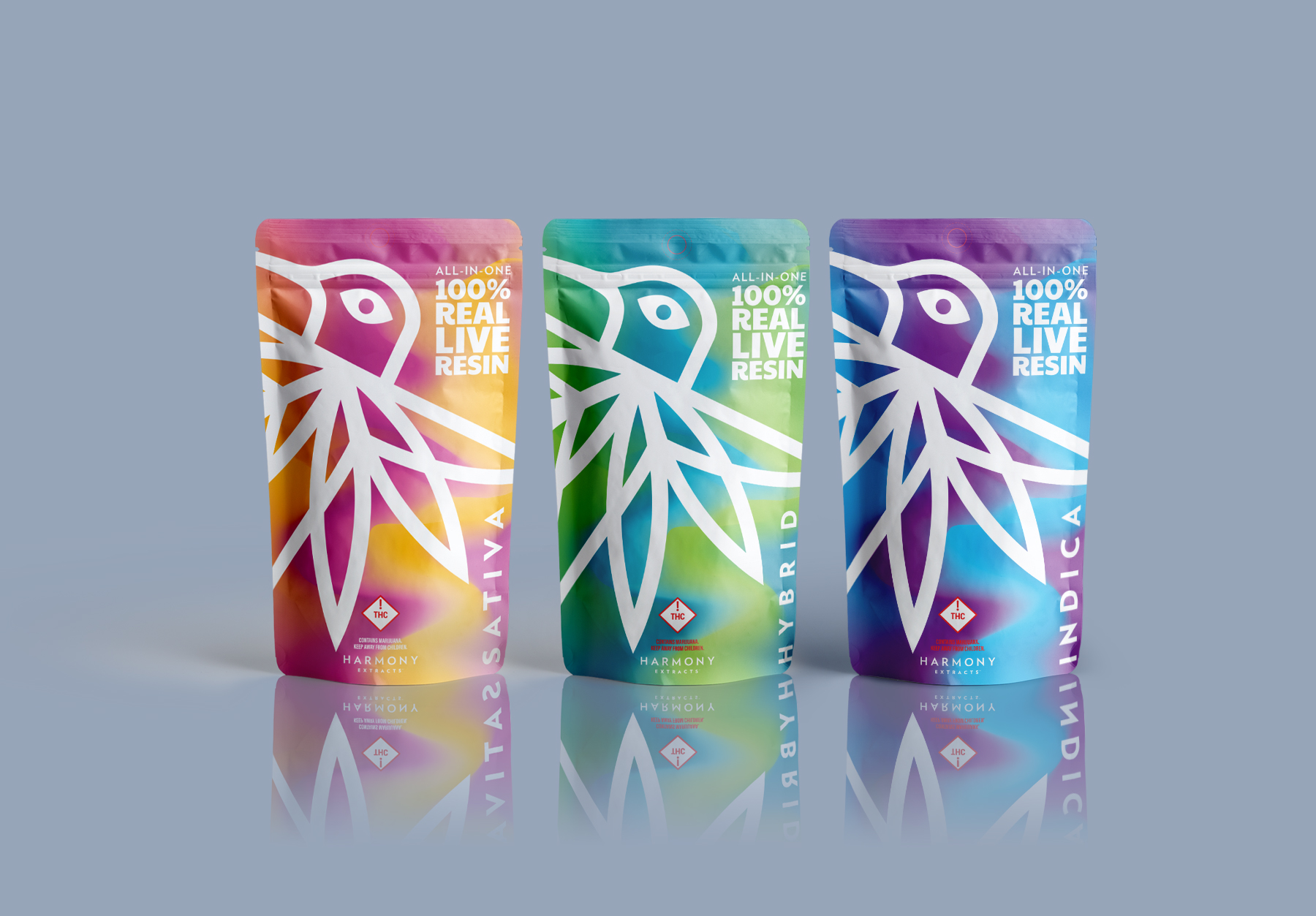 Redesigned Harmony Extracts’ mylar packaging to elevate their previous black, minimal designs into vibrant, eye-catching packaging. Each cannabis dominance strain (Indica, Sativa, Hybrid) was given a distinct color while maintaining the signature brand swirl pattern and emphasizing the company logo. The goal was to create packaging that not only stood out on shelves but also clearly communicated strain type and reinforced brand identity.