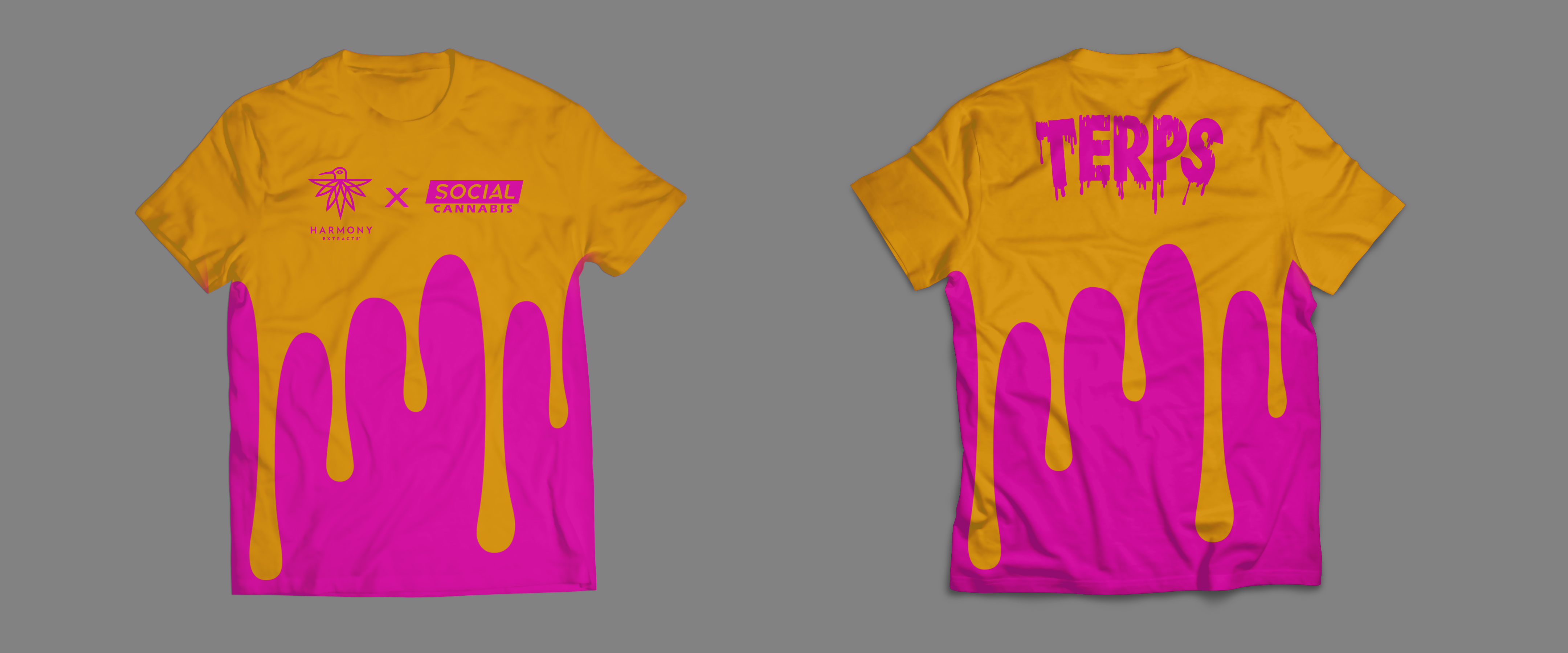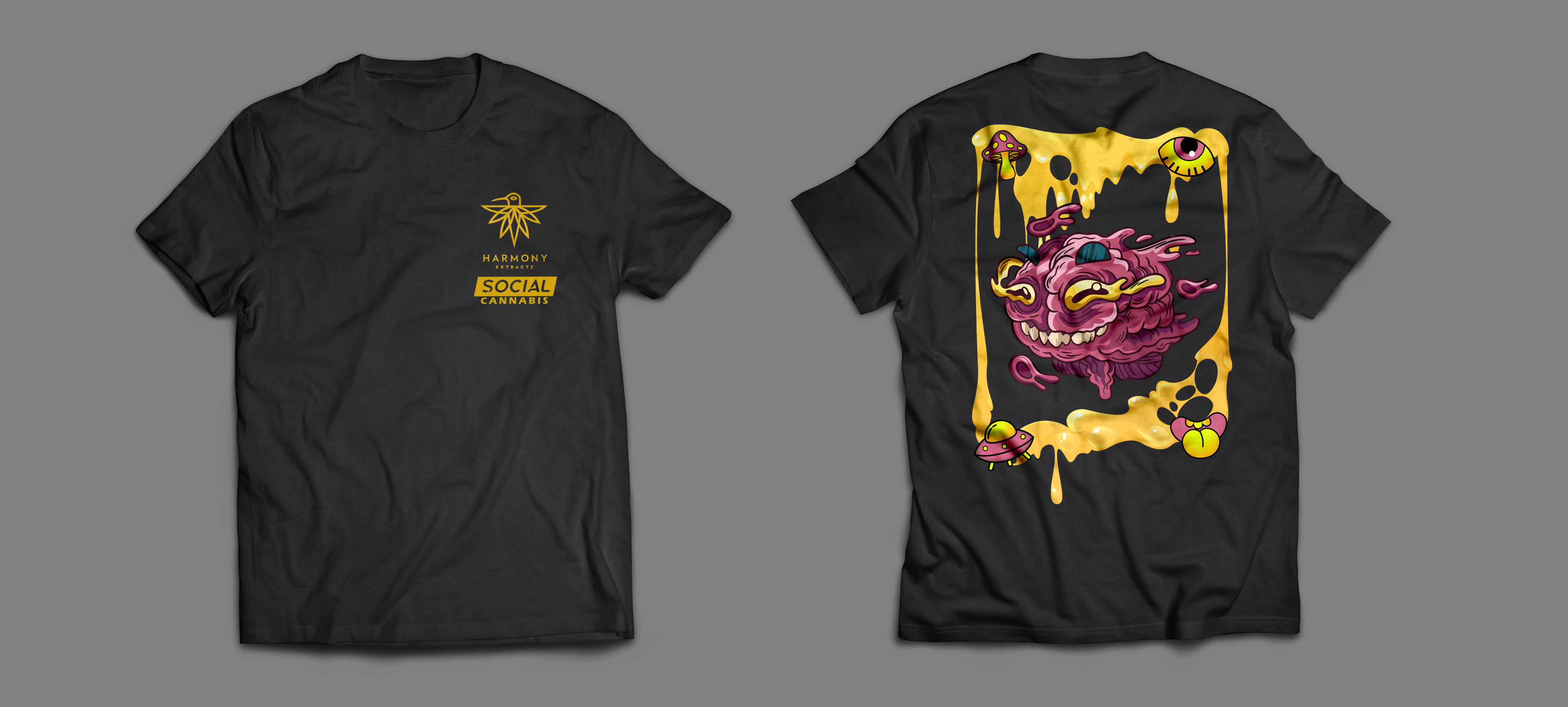 Designed t-shirts for the collaboration between Harmony Extracts and Social Cannabis, intended to be worn by Social Cannabis dispensary employees. The goal was to create designs that were fun, colorful, and engaging, resonating with the cannabis community while remaining professional enough for staff to wear on the job. Multiple concepts were developed, with two final designs selected for printing.
